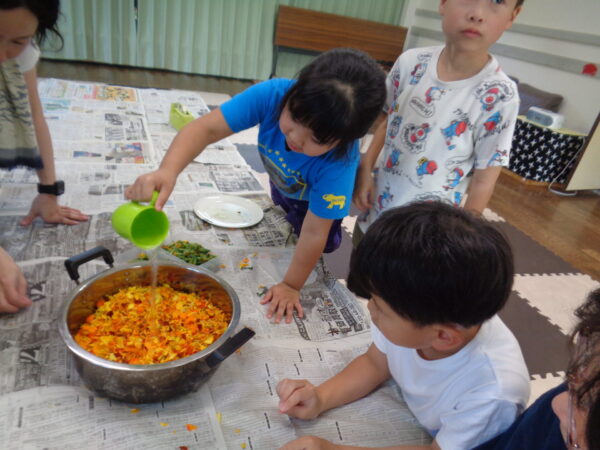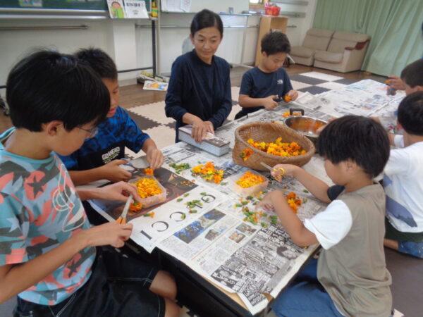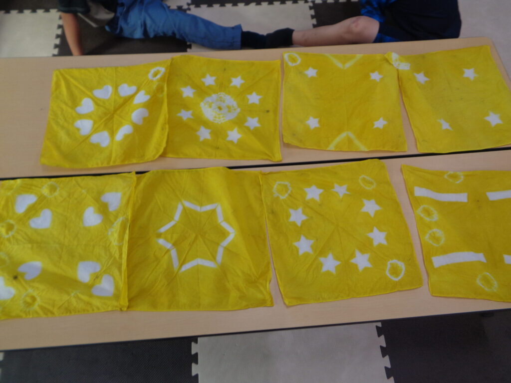 黄色の花びらを集めて煮汁を作り、その中に魔法の粉を入れて、白色の綿のハンカチに模様になるようにビー玉や木片を包んで輪ゴムできつく縛ったものを浸しました。
