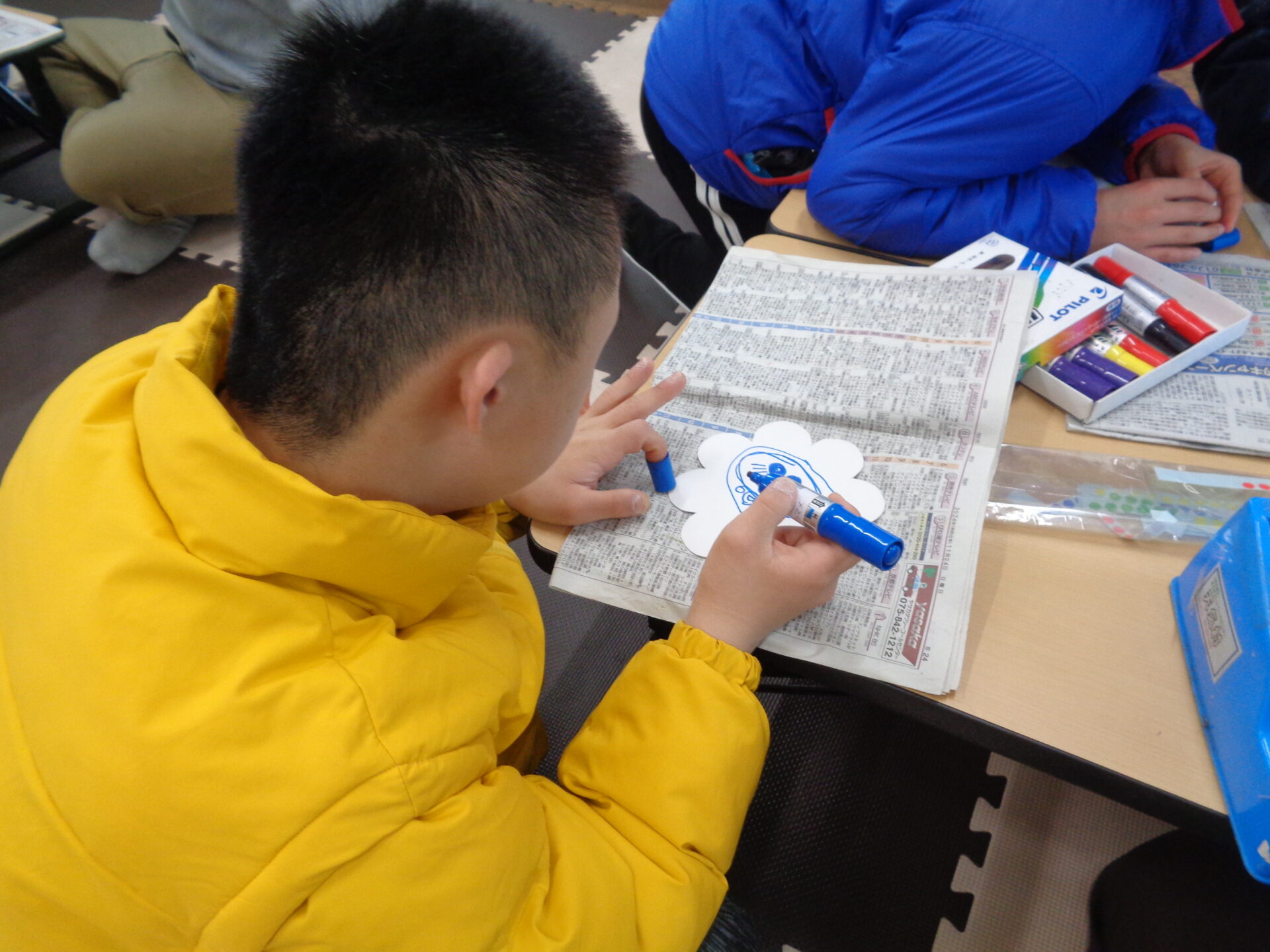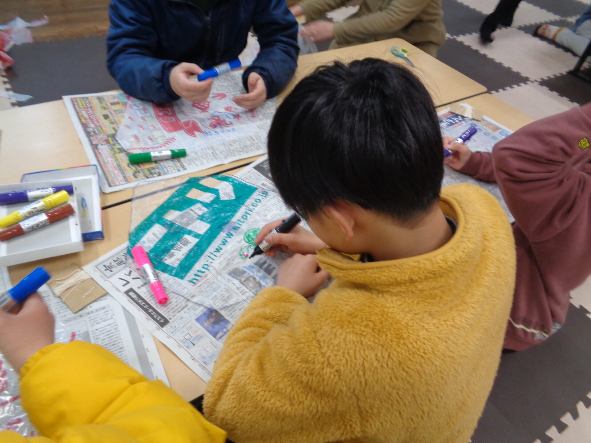 自分で絵をかいたり、好きな言葉をかいたりした凧を作って外へ。