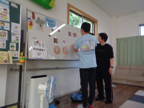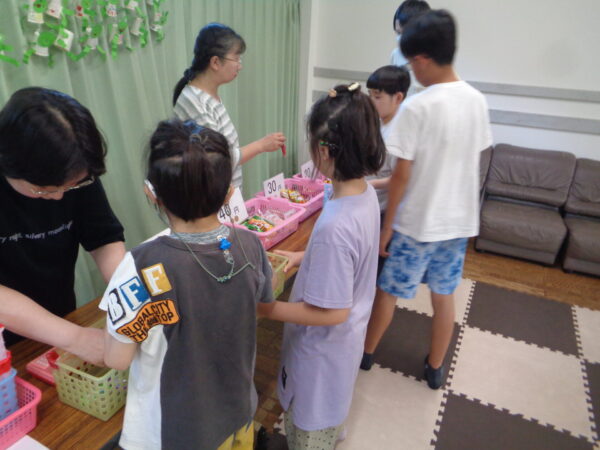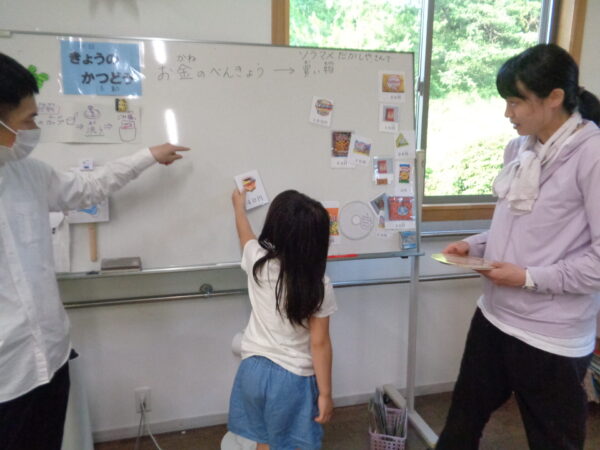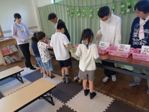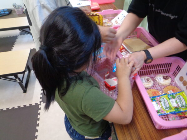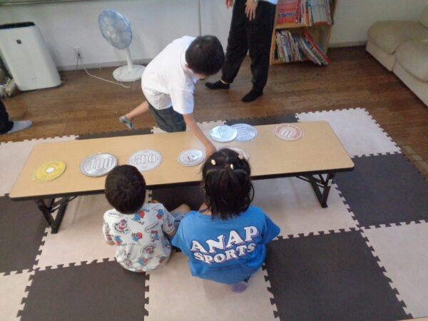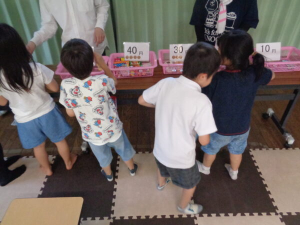 金種が分かっている子、そうでもない子と色々ですが、食べたいお菓子を選ぶ力はみんな持っています。 決まった金額の中で選べるものと断念しないといけないもの、支援者と相談したり、友達と相談したり。 いつも賑やかに楽しい活動です。