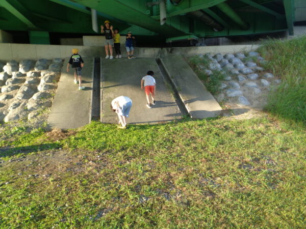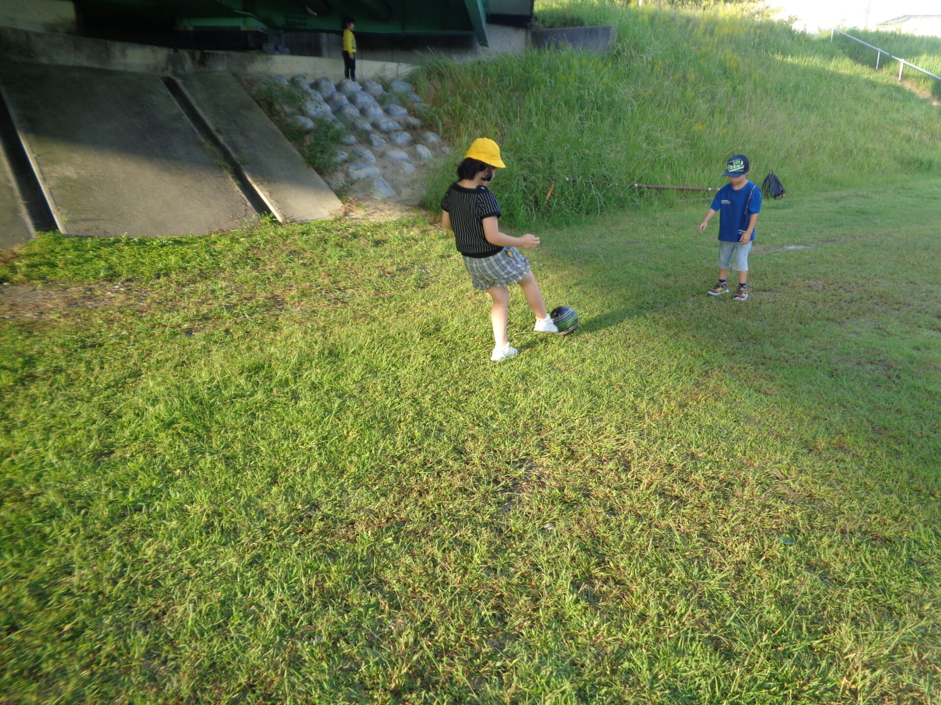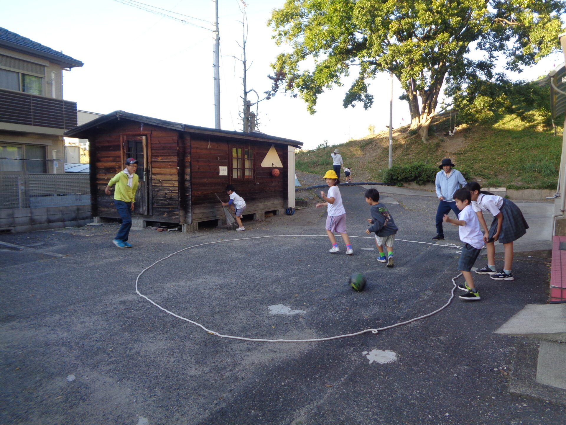 随分暑さが和らぎ、外遊びが気持ちよくなってきました。 少し離れた原っぱへ散歩がてらボールや虫取り網、カゴを持って行ったり、 転がしドッチボール、かくれんぼをしたり、気持ちの良い風を感じながら過ごしました。