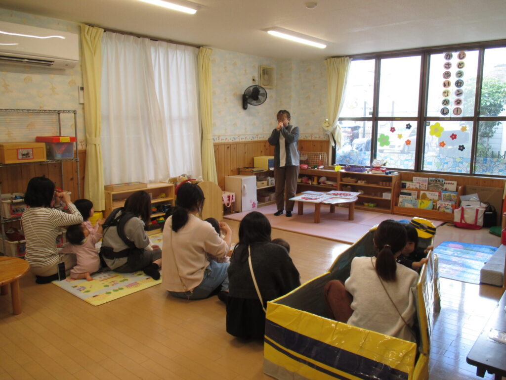 大型絵本を読んだり、手遊びをしたりして楽しんだ後、全体にファミサポ活動の説明をしました。