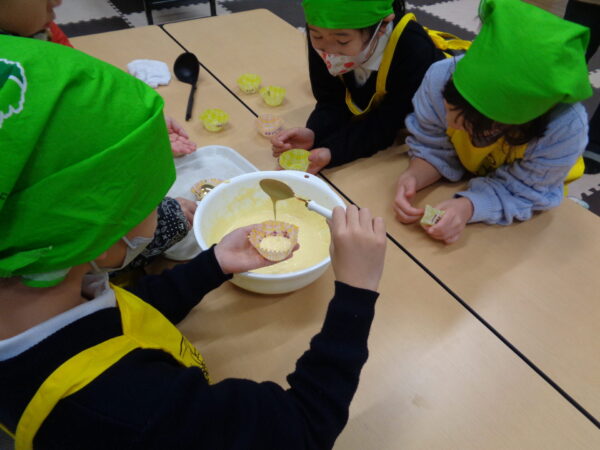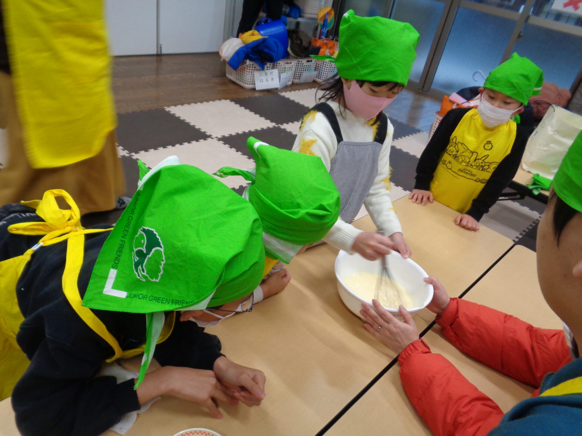 備蓄の大切さも伝え、ホットケーキミックスで竹パンや蒸しパンを作りました。