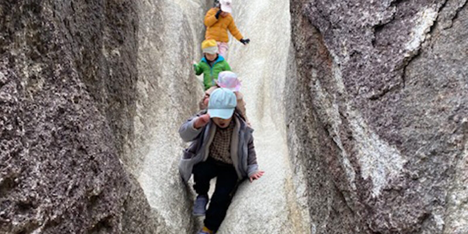 外遊びを中心に野外や自然の中で遊んで学ぶ保育です。子ども時代の遊びを通して遊びを組み立てられる力、遊びを創造する力を育てます。大自然に対して「しくまない教育の場」を提供し、小さなケガをたくさん繰り返し体験することで大きなケガを防ぐ野外体験保育です。